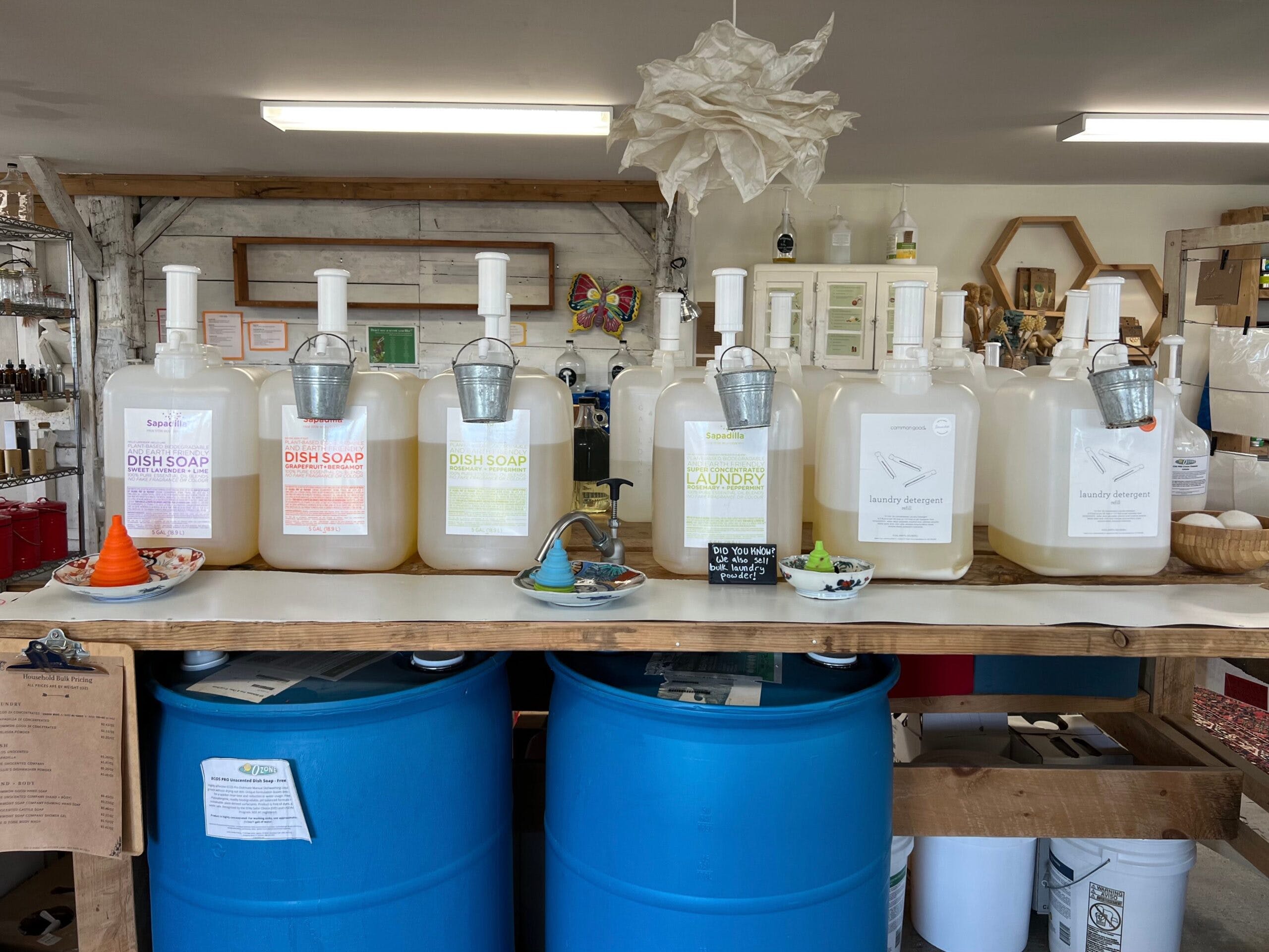 While each of the refill stores I’ve been to has a home-brewed vibe, it’s not like every detergent they sell is made out back by an amateur soaper mixing mutton tallow with lavender. Yes, the O Zone will sell you unscented castile soap, an all-natural, all-purpose cleanser that you can mix with the scented oil of your choice. But you can also buy professionally formulated cleaners from national companies like Ecos, Common Good, and Sapadilla. (All of these companies ship direct to consumers, by the way.) For those of you who feel most comfortable in Corporate America’s warm embrace, Sapadilla is owned by the Gorilla Glue Company, and though their dish soap is touted as all natural, many of its ingredients would not look out of place in a chemistry textbook.