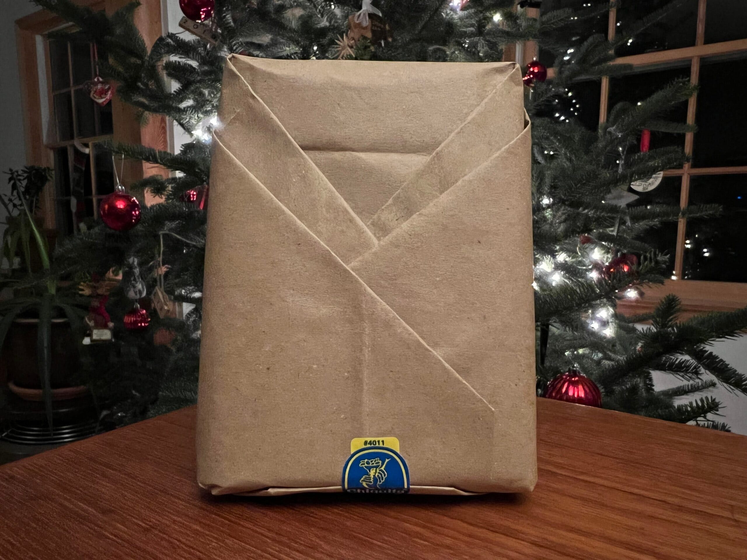 This sounded pretty janky to me (sorry, Sam), so I spent a few minutes on Pinterest, and… yup, still janky. So I decided to try it myself. I ended up doing a standard furoshiki fold, and honestly, not bad! I’ll keep practicing, and will keep an eye out for Rudolph sheets at the thrift store. Look out, Christmas 2022