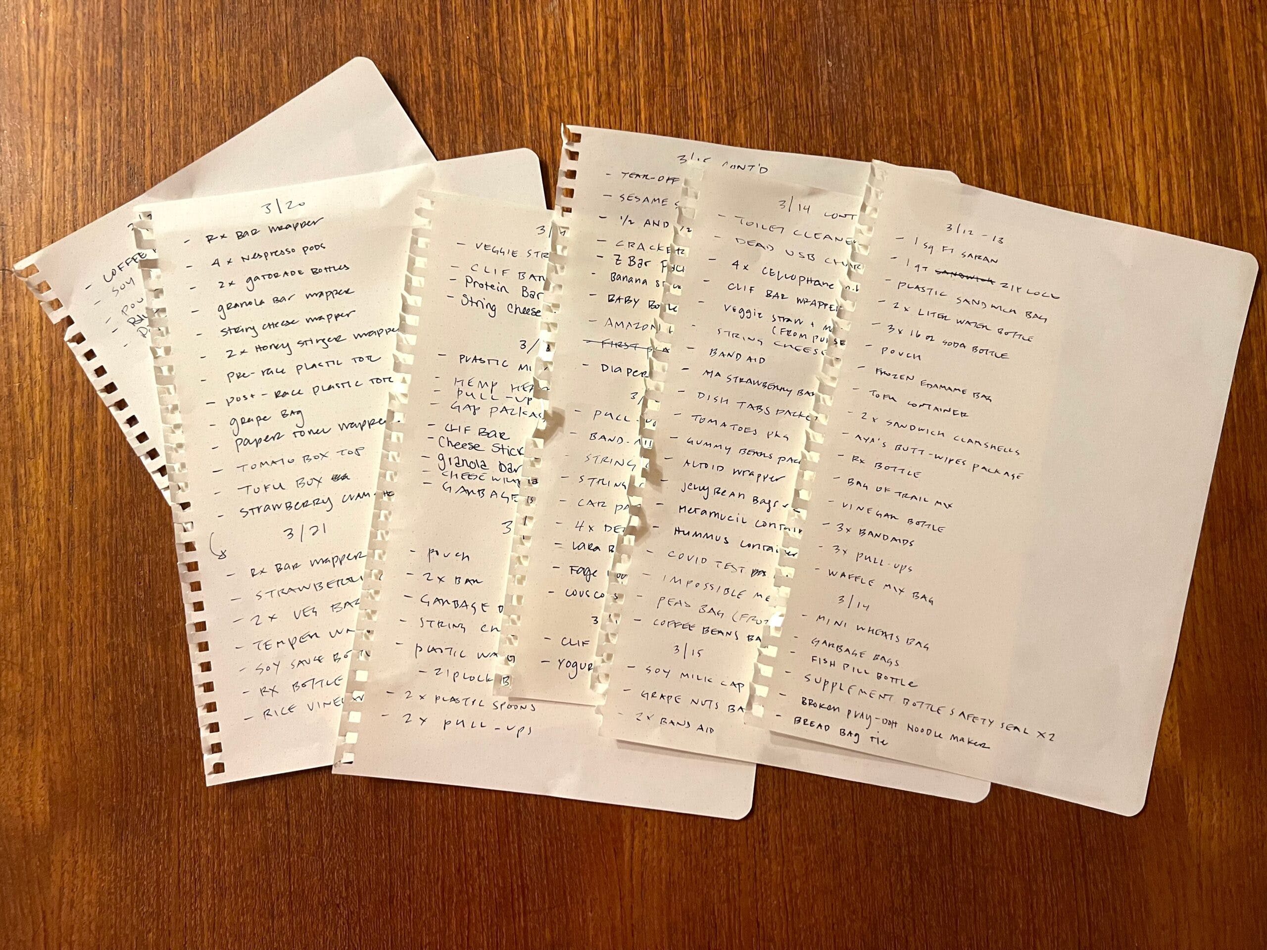 In 10 days, my family of three logged 138 items. Some of the stuff was abnormal, like the plastic bags full of disposable goodies my wife got for running the NYC Half Marathon (GO CHRISTINE!), but some of it represented essential parts of our daily lives: the pull-up diapers our kid wears to bed, the bandaids, the containers that all our tofu, soy milk, berries, cereal, supplements, snack foods, energy bars, coffee, jelly beans, peanut butter, feminine products, yogurt, and COVID tests come in. (Packaging accounts for 46 percent of all plastic waste.)