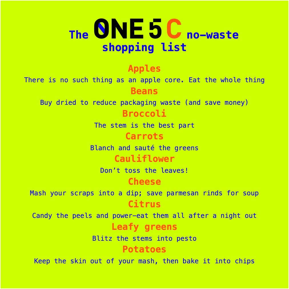 Fortunately, some measures can actually save you cash; cutting down on food waste is one. It’s an easy environmental win that anyone can put on the board. And though we should all strive for perfection 🧘♂️, just doing *better* can make a massive impact. If everyone in America cut their food waste by half—that’s 50%, a letter grade of D—we could reduce the U.S.’s greenhouse gas output by 2%. That’s 104 million metric tons kept out of the atmosphere by cooking, ordering, and shopping smarter.